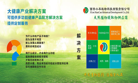 西安市小草植物科技有限責(zé)任公司成立于2004年,工廠位于西安市周至縣集賢工業(yè)區(qū),辦公室位于西安高新區(qū),一家具有進(jìn)出口權(quán)的技術(shù)型民營(yíng)企業(yè)。